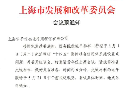 2019年6月4日,上海华予信企业信用征信有限公司受邀参加上海市发展和改革委员会举办的“十四五”期间社会信用体系建设重点问题座谈会。