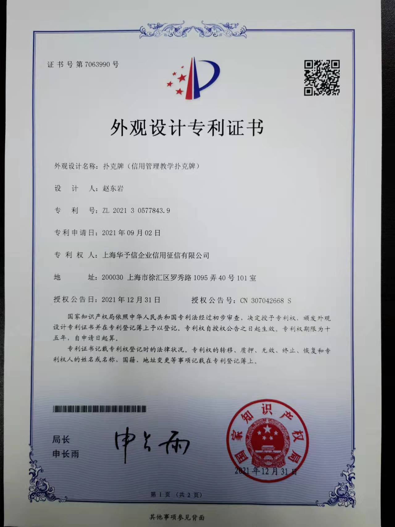 2021年9月02日,华予信获得国家知识产权局颁发的外观设计专利证书,专利为“信用管理教学扑克牌”。
