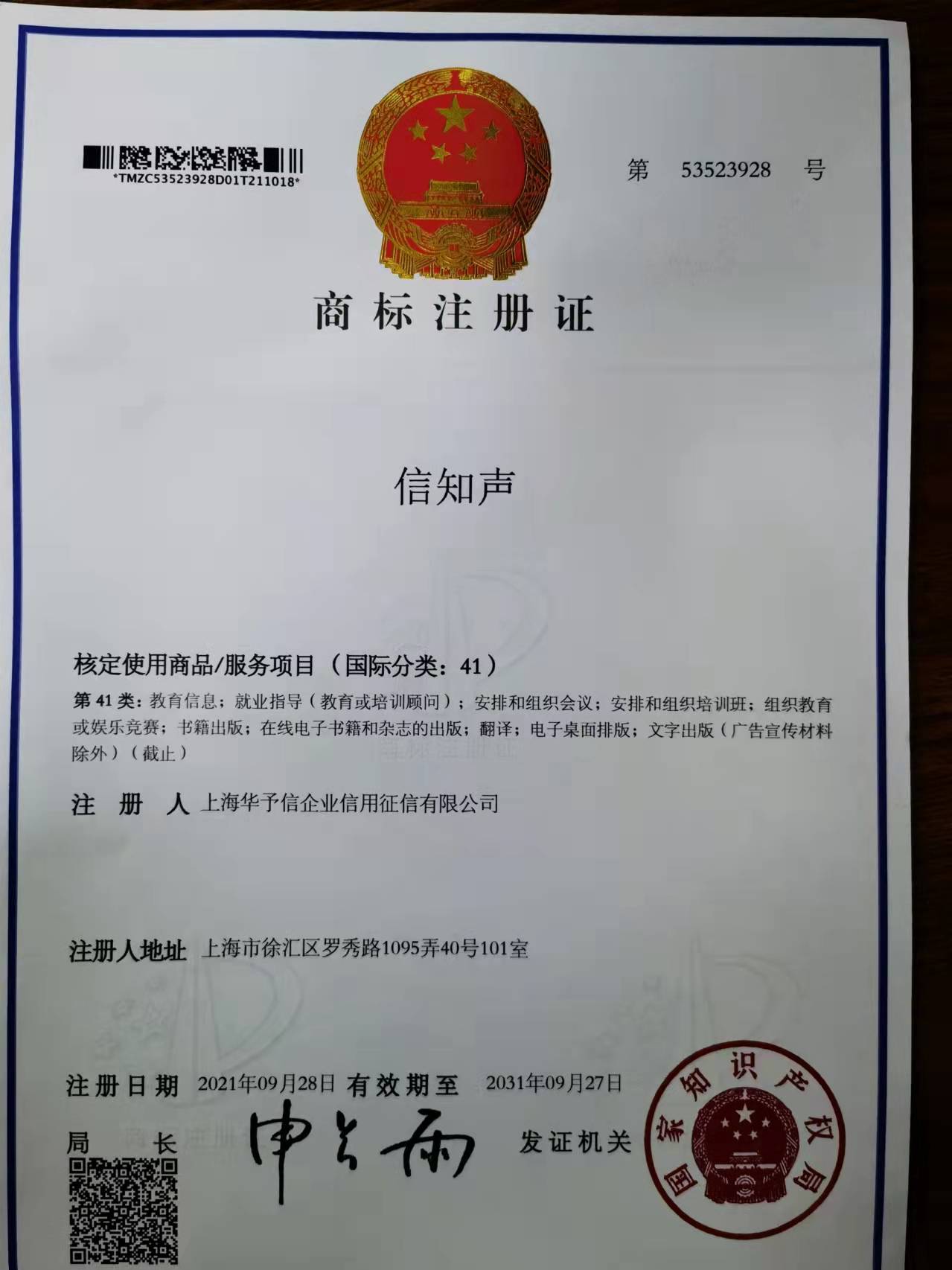 2021年9月28日,华予信申请的“信知声”商标注册获得国家产权局批准;